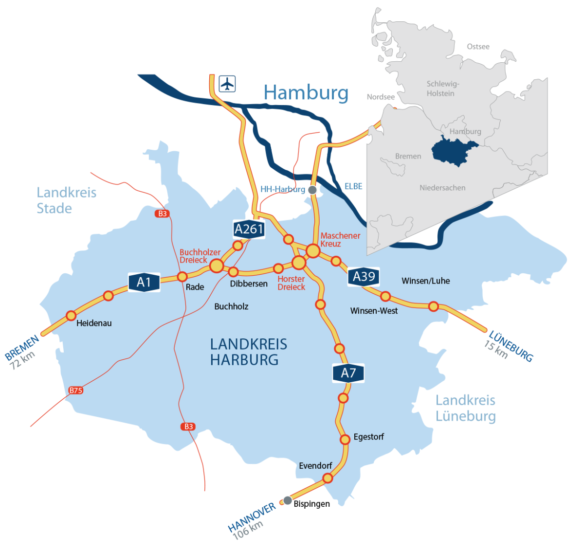 Der Landkreis Harburg ist das Zentrum der südlichen Metropolregion Hamburg und ist geprägt von Wirtschaftskraft und Wachstum einerseits und einer hohen Lebensqualität zwischen Elbe und Heide andererseits. Von seinem Verwaltungssitz, der Kreishauptstadt Winsen (Luhe), bis zum Hamburger Hafen und in die Hamburger City sind es nur rund 30 km elbabwärts oder 30 Minuten mit Auto oder Lkw.