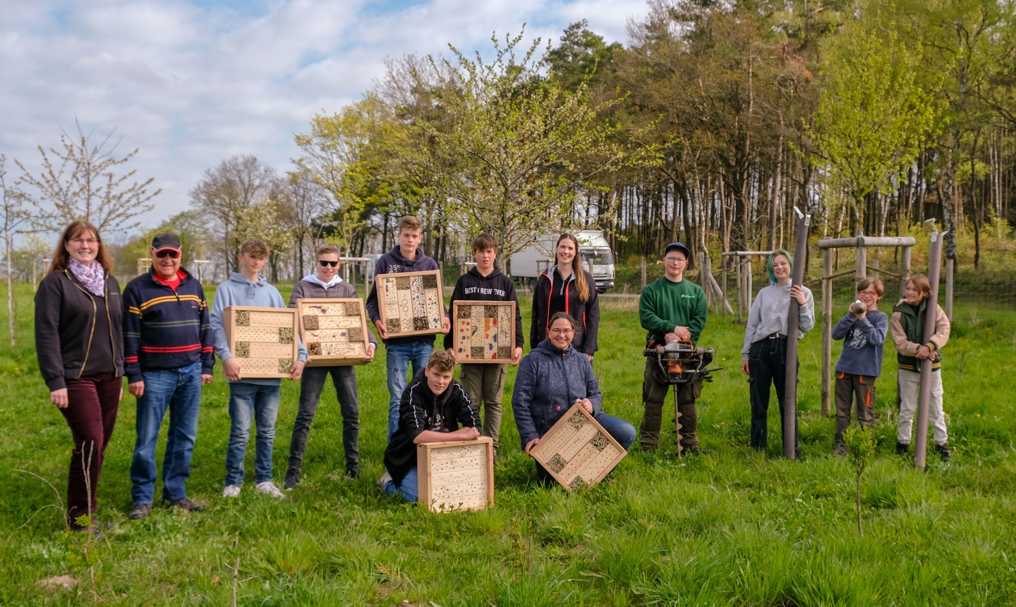 Sie haben gebohrt, geschraubt, gesägt, geschmirgelt und dabei viel über das Leben von Insekten und Wildbienen gelernt: Bei strahlendem Sonnenschein installierten Schüler*innen der Oberschule Jesteburg mit gymnasialem Angebot und der Grundschule Nenndorf sechs selbst gebaute Nisthilfen für Wildbienen in den Streuobstwiesen im TIP Innovationspark Nordheide in Buchholz.